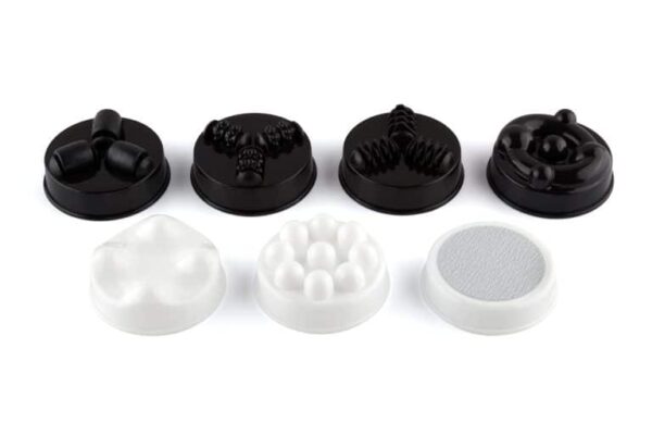 Masažuoklis komplektuojamas su unikalių masažo galvučių rinkiniu, pritaikytų universaliam naudojimui.