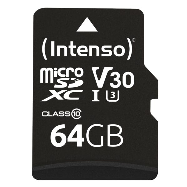 | Summary | Intenso 3433490. Capacity: 64 GB, Flash card type: MicroSDXC, Flash memory class: Class 10, Internal memory type: UHS-I, Read speed: 100 MB/s, Write speed: 45 MB/s, UHS Speed Class: Class 3 (U3), Video Speed Class: V30. Protection features: Shock resistant, Temperature proof, Waterproof, X-ray proof, Product colour: Black |