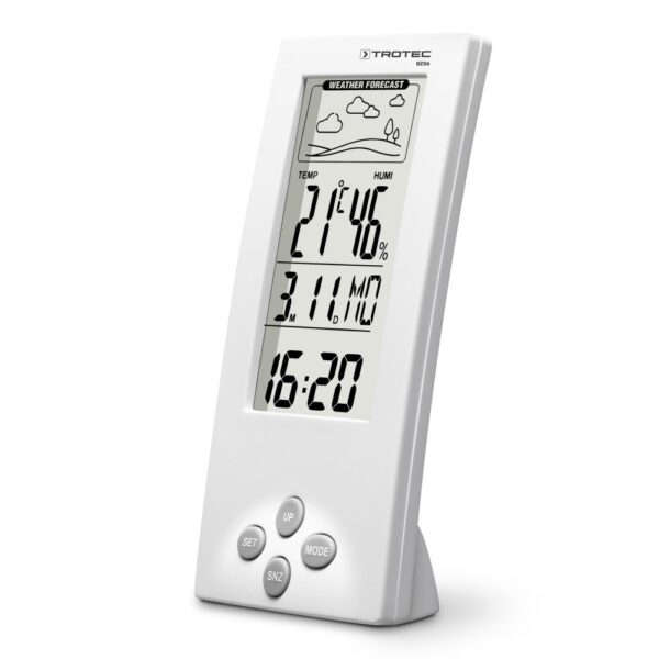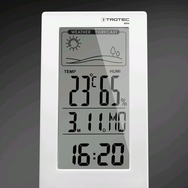 Šiuolaikiško dizaino meteorologinė stotelė BZ 06 vos žvilgtelėjus perteikia informaciją apie patalpoje esantį klimatą. Skaitmeniniame ekrane dideliais skaitmenimis nurodoma esama patalpų temperatūra (°C arba °F), drėgmės lygis (%), data, savaitės diena ir laikas 12 arba 24 valandų formatu. Be to, grafiškai parodyta orų prognozė rodo artėjančius orų pokyčius. Dar daugiau, šioje stotelėje įmontuotas žadintuvas su atidėjimo funkcija. BZ 06 galite pastatyti visur, kur jums patinka: svetainėje, virtuvėje, vaikų kambaryje, miegamajame, vonios kambaryje, darbo vietoje ar net pasiimti su savimi į kelionę. Orų stotelė neskleidžia jokių garsų, todėl netrukdys net miegant.