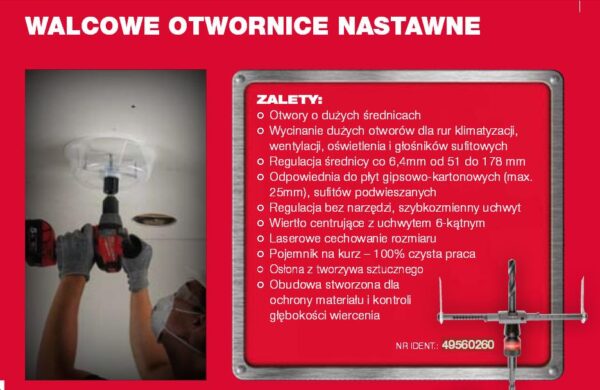 Didelio skersmens skylės Didelių skylių pjovimas oro kondicionavimo, ventiliacijos vamzdžiams, apšvietimui ir lubiniams garsiakalbiams Skersmens reguliavimas kas 6,4 mm nuo 51 iki 178 mm Tinka gipso kartono plokštėms (maks. 25 mm), pakabinamoms luboms Reguliavimas be įrankių, greito keitimo laikiklis Centravimo grąžtas su 6-kampiu laikikliu Lazerinis dydžio žymėjimas Dulkių surinkimo indas – 100 % švarus darbas Plastikinis gaubtas Korpusas sukurtas medžiagos apsaugai ir gręžimo gylio kontrolei. Specifikacija: Centravimo grąžtas, 2 ašmenys, QL velenas, apsauga nuo dulkių Skersmuo: 51, 178 mm.