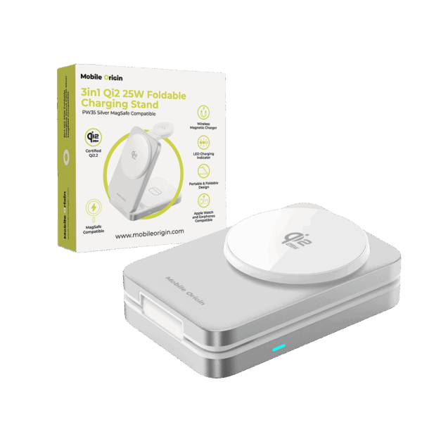 Mobile Origin 3in1 Qi2 25W Foldable Charging Stand PW35,MagSafe Compatible – Silver