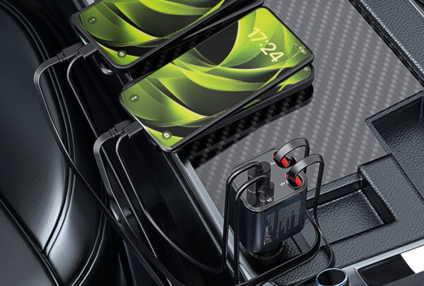 – 4in1 Car Charger 50W CA28 – USB-C + USB-A, USB-C and Lightning Cable