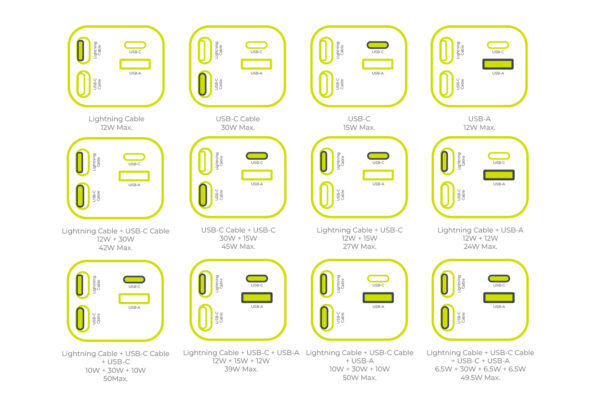 - Four outputs: USB-C, Lightning cable, USB-A, USB-C port
