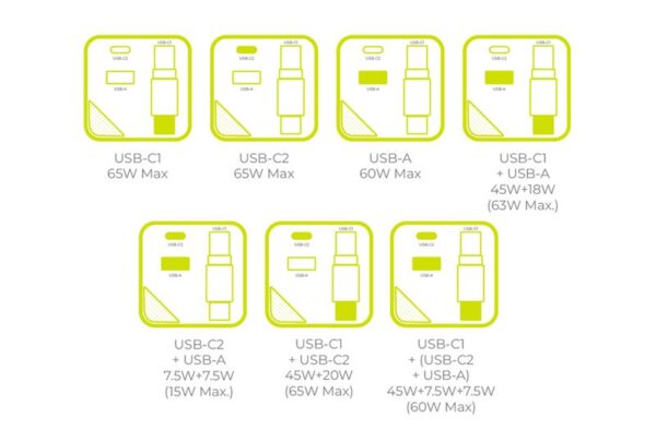 – USB-C1 + (USB-C2 + USB-A): 45W + 7.5W + 7.5W (60W Max)