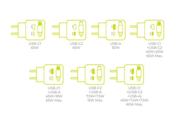 – USB-C1 + USB-A: 45W+18W (63W Max)