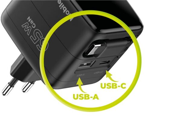 - 65W output power – Fast charging for laptops and phones.