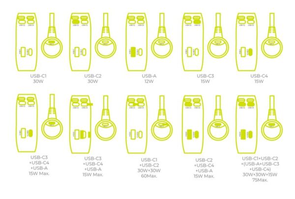 - USB-C3+C4+USB-A: 5V⎓3A (15W Max)