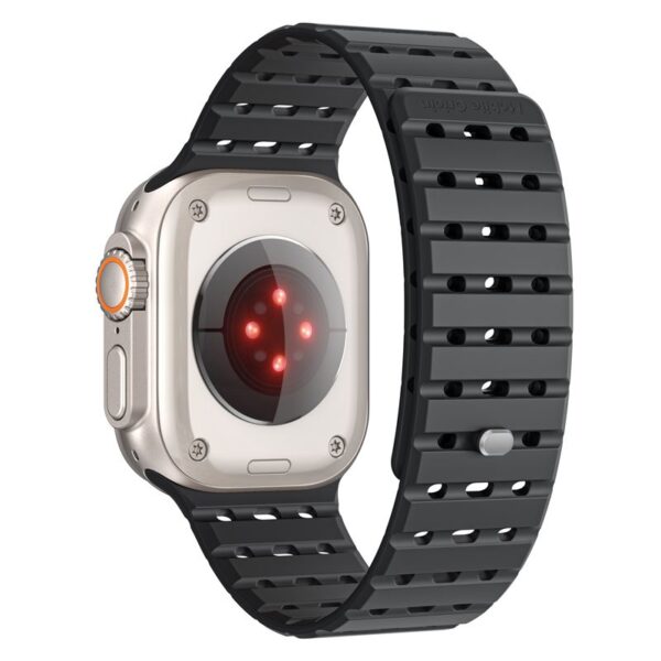 - Elegant Black Strap with Magnetic Closure for Apple Watch. Specifically designed for Apple Watch models 44 mm, 45 mm, 46 mm, and 49 mm, this stylish strap combines everyday comfort with a sporty, modern look. The magnetic closure is reinforced with a discreet metal safety lock, ensuring a secure fit even during movement. Made from soft yet durable silicone, it feels comfortable on the skin and resists dirt. The perforated design enhances breathability and provides all-day wearing comfort. Fits wrists up to 200 mm in circumference.