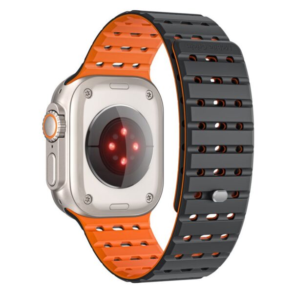 - Elegant Black Strap with Magnetic Closure for Apple Watch. Specifically designed for Apple Watch models 44 mm, 45 mm, 46 mm, and 49 mm, this stylish strap combines everyday comfort with a sporty, modern look. The magnetic closure is reinforced with a discreet metal safety lock, ensuring a secure fit even during movement. Made from soft yet durable silicone, it feels comfortable on the skin and resists dirt. The perforated design enhances breathability and provides all-day wearing comfort. Fits wrists up to 200 mm in circumference.