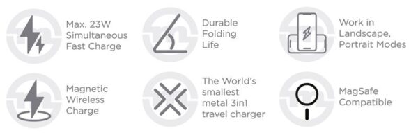 It works in landscape and portrait modes with up to 23W simultaneous magnetic fast charge and is compatible with MagSafe.