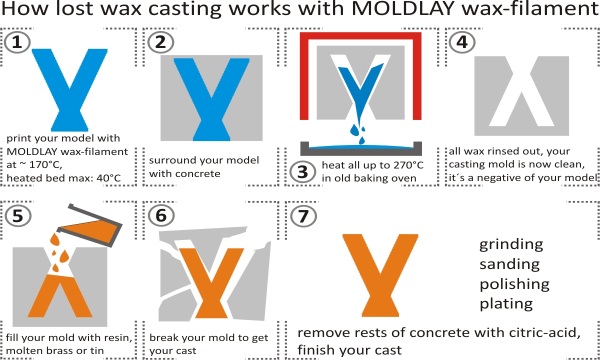 Moldlay wax-like filament is a special filament which can be processed with any 3D printer in the FDM process. This wax-like filament is designed to enable mold making. With this thermoplastic wax-like filament, molds can be produced. Likewise, the Moldlay filament can be used for the lost wax casting process.