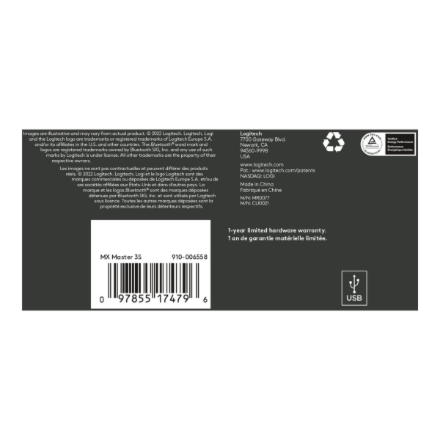 (1) 4 mm minimum glass thickness (2) Compared to MX Master 3, MX Master 3S has 90% less Sound Power Level left and right click, measured at 1m (3) Compared to regular Logitech mouse without an electromagnetic scroll wheel (4) Compared to Logitech Master 2S mouse with Logitech Options installed and Smooth scrolling enabled (5) Requires Logi Options+ software, available for Windows and macOS (6) Not compatible with Logitech Unifying technology (7) Battery life may vary based on user and computing conditions. (8) Device basic functions will be supported without software for operating systems other than Windows and macOS (9) Wireless range may vary depending on operating environment and computer setup (10) Excludes plastic in printed wiring assembly (PWA), receiver, wire, FFC cable, and packaging.