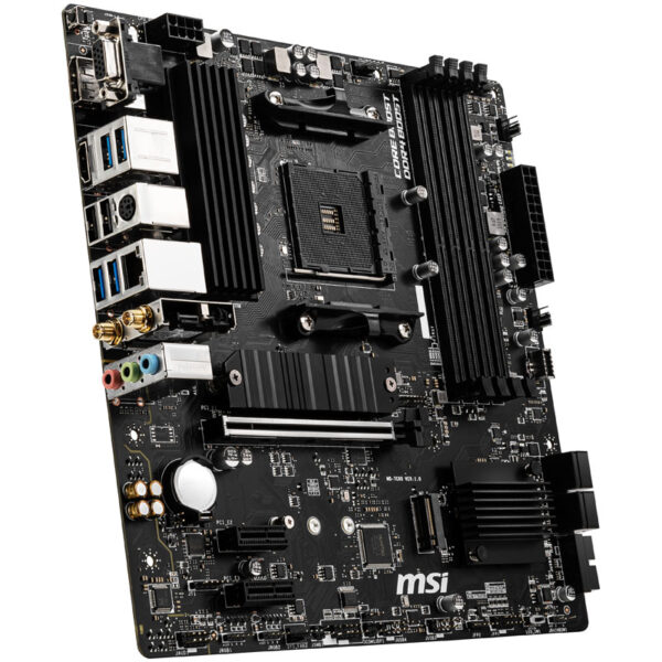 The B550 chipset is the heart of the MSI B550M Pro-VDH WiFi motherboard and has been specifically optimised for the Ryzen CPUs of the 3000 series „Matisse” and the 5000 series „Vermeer”. B550 motherboards support all features of third and fourth generation Ryzen processors, especially the PCI Express standard in version 4.0 (PCIe 4.0). PCIe 4.0 is backwards compatible and can be used with all expansion cards from previous generations. In addition, the motherboards support up to 128 GB of RAM with a guaranteed clock speed of 3,200 megahertz. Depending on the motherboard, significantly higher clock speeds are also possible via overclocking. The B550 chipset also allows for processor overclocking.