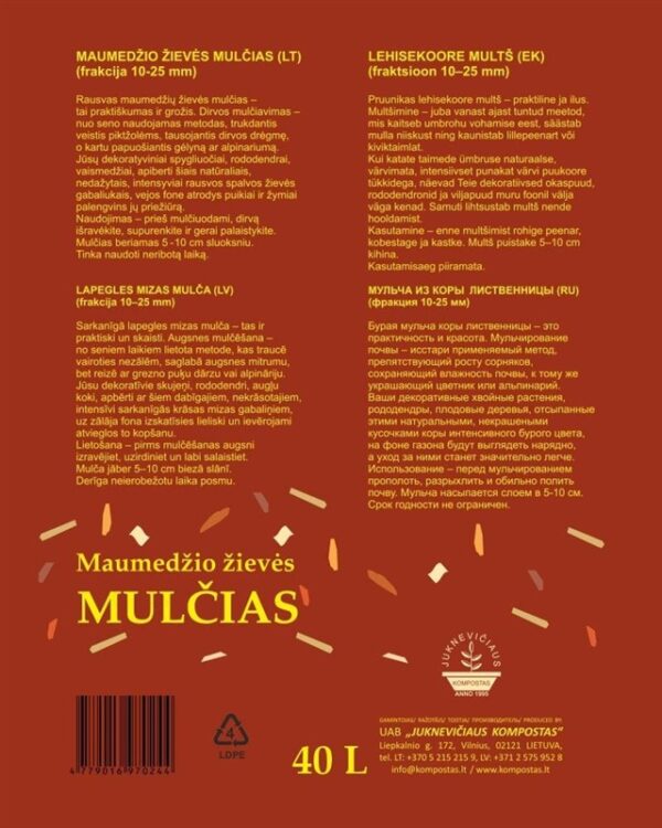 Prekės ženklas- Juknevičiaus. Tūris- 40 l. Paskirtis- Rausvas maumedžių žievės mulčias – tai praktiškumas ir grožis. Dirvos mulčiavimas – nuo seno naudojamas metodas, trukdantis veistis piktžolėms, tausojantis dirvos drėgmę, o kartu papuošiantis gėlyną ar alpinariumą.. Frakcija- 10 – 25. Garantija- 24 mėn.