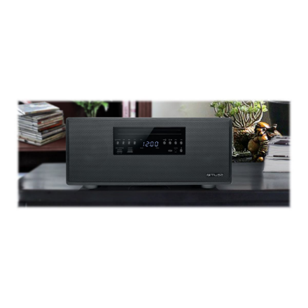 | Funkcijos | Stream music from another Bluetooth compatible device such as Laptop, Tablet or Smartphone; Clock function; Passive bass; Wooden cabinet |