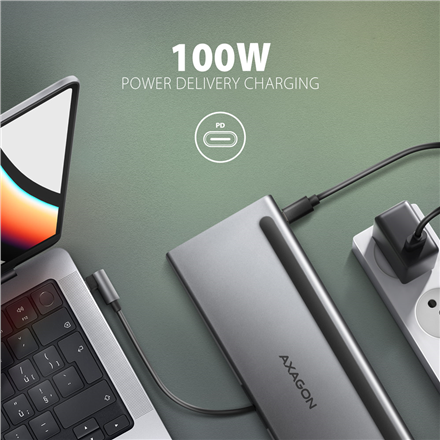 Multiport USB-C 5Gbps TRIPLE 4K DISPLAY hub AXAGON HMC-4KX3 expands your laptop with nine ports and memory card reader SD / microSD. You can easily and quickly connect up to three monitors, three USB devices, a Gigabit Ethernet network, headphones and card reader to your computer at the same time via the double-sided USB-C connector. You also get the possibility to supply laptop using Power Delivery technology at the same time. The USB-C hub will provide you with a universal and powerful 11in1 docking station for modern laptops.