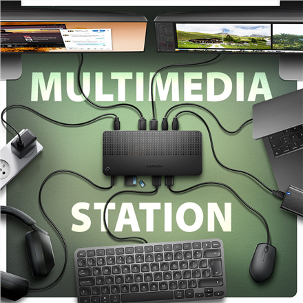 AXAGON HMC-U4 DUAL 4K DISPLAY dock turns your laptop, tablet or phone into a multimedia centre. With the next generation USB4 technology, this docking station offers a total data throughput of up to 40 Gbps. So, you can take full advantage of even the most demanding computer accessories and enjoy a high-end experience. Whether you’re watching 8K video or working with two 4K monitors simultaneously, this technology delivers the performance you need. USB4 offers the benefit of Thunderbolt compatibility while supporting backward compatibility with previous generations of USB.