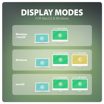 • To achieve maximum resolution and frequency values on video outputs, the dock must be plugged into a USB-C port supporting DisplayPort Alternate Mode (DP Alt Mode) version min. 1.4 or a USB-C port supporting min. Thunderbolt 4. A suitable updated OS and up-to-date graphics drivers are also required.