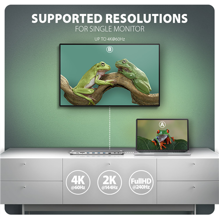 • For the video output function, the hub must be connected to a USB-C port supporting DisplayPort Alternate Mode (DP Alt Mode) or to a USB-C port supporting Thunderbolt 3/4. A suitable OS is also required. The video output function will not be available without these requirements.