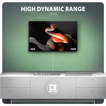 Thanks to HDR (high dynamic range) support, you can enjoy a significantly expanded range of colors and contrasts without restrictions. For video outputs to work properly, the laptop must have a USB-C port with DisplayPort Alternate Mode (DP Alt Mode) support or a Thunderbolt 3 port and above.