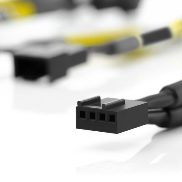 The NA-SYC1 chromax.yellow is a fan accessory set consisting of three NA-YC1 y-cables that make it possible to run two 4-pin PWM fans on a single fan header and to let the motherboard control the speed of both fans simultaneously. Multiple NA-YC1s can be daisy-chained to control more than two PWM fans via one header. The NA-YC1’s 4-pin connectors are compatible with both 3-pin and 4-pin PWM fans, but PWM control is only supported with 4-pin fans. Thanks to the yellow sleeving, the cables are ideal for creating PC builds with neat, focused aesthetics and are a perfect match for Noctua’s chromax edition fans.