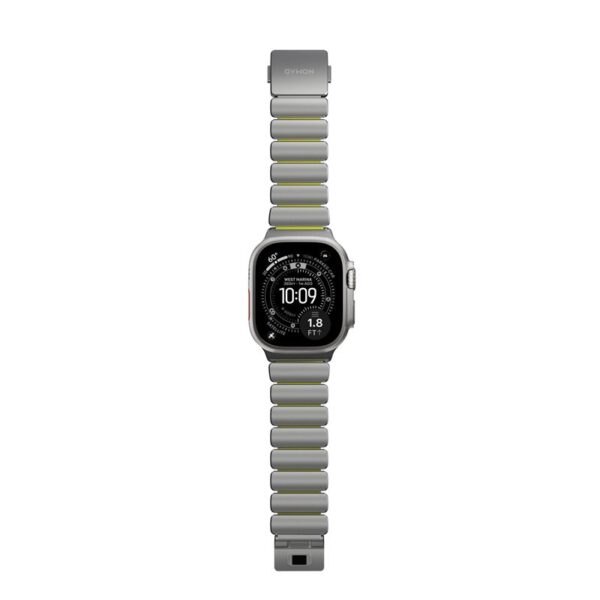 Stratos Band is a band unlike anything ever made for Apple Watch. It was created by combining Grade 4 titanium with compression-molded FKM rubber, resulting in a bracelet that looks like metal but wears like a high-performance gear.
