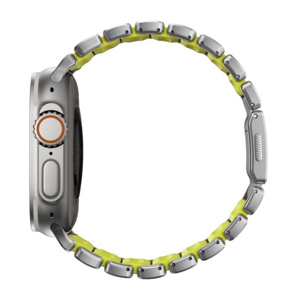 The outer titanium links give the bracelet strength, structure, and a refined industrial look, while the inner FKM links provide waterproof durability, flexibility, and all-day comfort. The FKM core shows through the gaps in the titanium, giving the band its signature hybrid look that feels more like gear than an accessory.