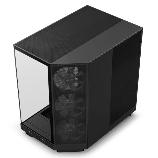 Experience performance with a fresh perspective. The H6 Flow’s innovative compact design emphasizes GPU cooling with a strategically angled front corner, so the fans direct air where it’s most needed. The panoramic glass proudly showcases the interior, while the dual-chamber layout frees up space for a cleaner look and better cooling performance