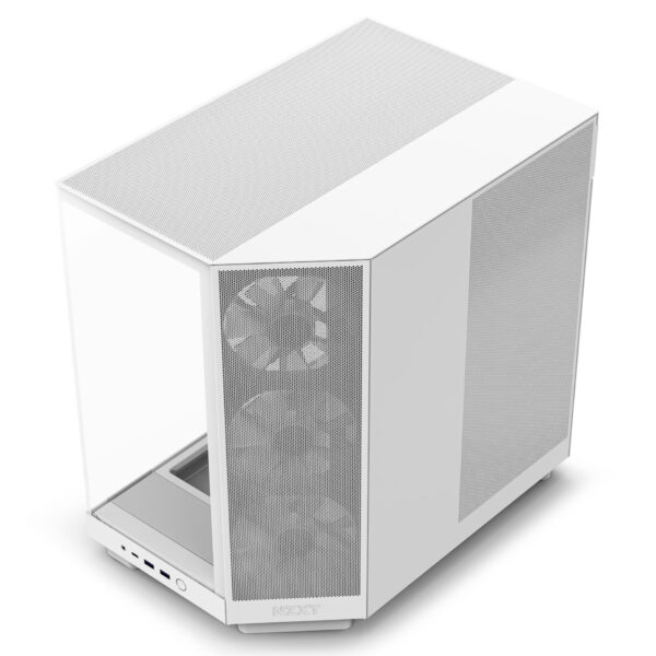 The angled front-right corner with 3 x 120mm fans targets heat-prone components. Supports 2 x 140mm fans beneath the GPU for optimal cooling while perforated panels enhance airflow.
