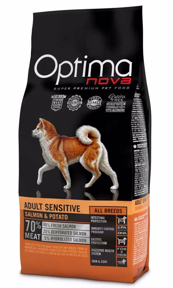 Optima Nova Dog Adult Sensitive Salmon & Potato sausas pašaras šunims, 12 kg