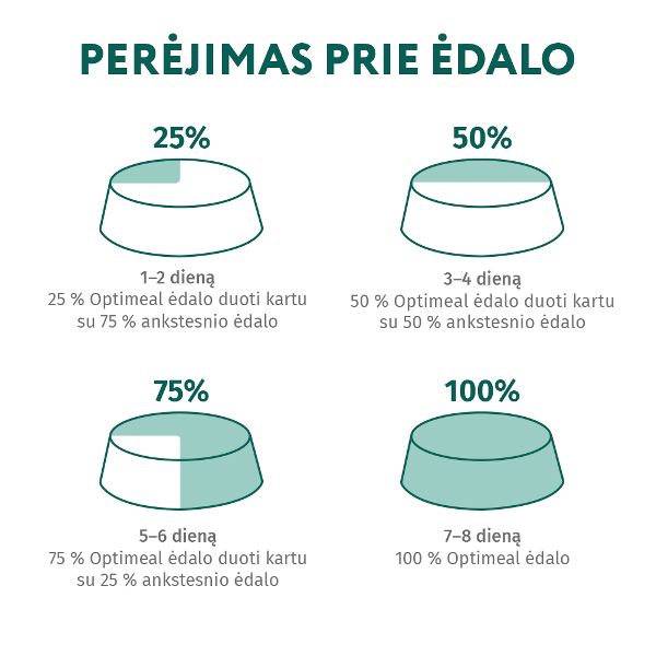 OPTIMEAL™. Hipoalerginis visavertis pašaras vidutinių didelių veislių suaugusiems šunims – lašiša. Lašiša, kaip vienintelis hipoalerginių baltymų šaltinis, apsaugo šunis nuo alerginių reakcijų. Palaiko sąnario sveikatą. Stiprina imuninę sistemą. Sudėtis: dehidratuoti lašišų baltymai 26 %, ryžiai, miežiai, vištienos riebalai, mėsa be kaulų lašišos 5 %, hidrolizuoti gyvūniniai baltymai 5 %, džiovintos bulvės, lašišų aliejus, mineralai, linų sėmenys 1,66 %, cukrinių runkelių išspaudos, alaus mielės, spanguolės 0,2 %, vaistinės agurklės aliejus, beta-1,3/1,6-gliukanai 0,05 %, Actigen® (prebiotiko ir oligosacharido šaltinis) 0,04 %, gvazdikiniai serenčiai (liuteino šaltinis) 0,04 %, varnalėšų šaknys, vaistinė svilarožė gliukozaminas (350 mg/kg), ramunėlių žiedai 0,03 %, dilgėlės 0,03 %, jukos ekstraktas, hondroitinas (230 mg/kg), čiobreliai 0,015 %. Analitinės sudedamosios dalys: žali baltymai – 26 %, žali riebalai – 17 %, žali pelenai – 5,8 %, žalia ląsteliena – 1,3 %, drėgnis – 9 %, kalcis – 1,2 %, fosforas – 1 %, magnis – 0,07 %. 1 maisto kg: omega- 3 riebalų rūgštys – 11,2 g, įskaitant EPA / DHA – 7,4 g, omega- 6 riebalų rūgštys – 26 g. 76,19 % žuvų kilmės baltyminiai pašarai. Priedai (1kg pašaro): maistiniai priedai, mg/kg: Vitaminas A (3a672a): 15 000 TV, Vitaminas D3 (3a671): 800 TV, vitaminas E (3a700): 500, vitaminas C (3a312): 200, Vitaminas B6 (3a831): 2,22, biotinas (3a880): 0,14, taurinas (3a370): 1 100; mikroelementų junginiai: cinkas (3b603): 104,96, varis (3b405): 11,24, manganas (3b502): 2,57, selenas (3b801): 0,08. Technologiniai papildai (1 maisto kg), mg/kg: natūralios kilmės antioksidantas: 330, natūralios kilmės tokoferolio ekstraktas: 600. Energetinė vertė 100 g ėdalo: 1673,31 kJ (399,94 kcal). Pagaminimo data, data „geriausias iki …“, partijos numeris ant paketo. Laikymo sąlygos: laikyti vėsioje, sausoje vietoje, apsaugotoje nuo tiesioginių saulės spindulių.