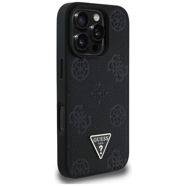 Originalus Dėklas GUESS Grained Hot Stamp Peony Triangle Logo MagSafe skirtas Apple iPhone 16 Pro juodos spalvos