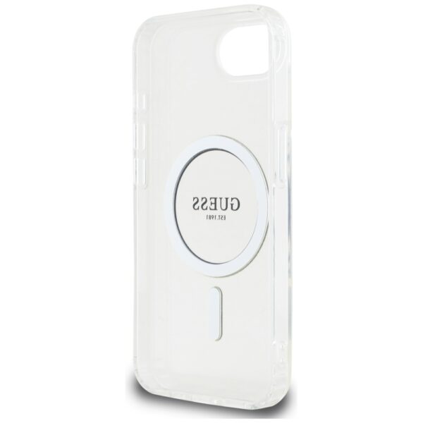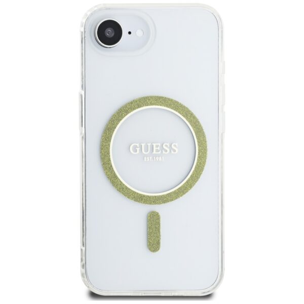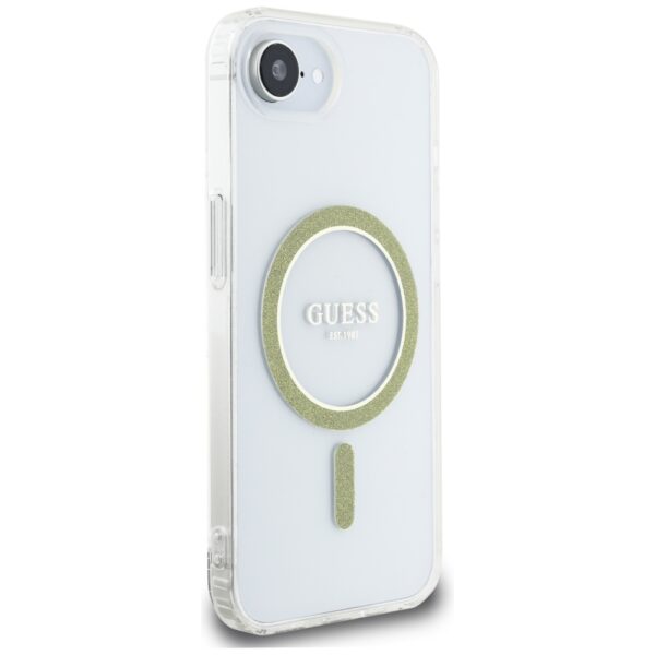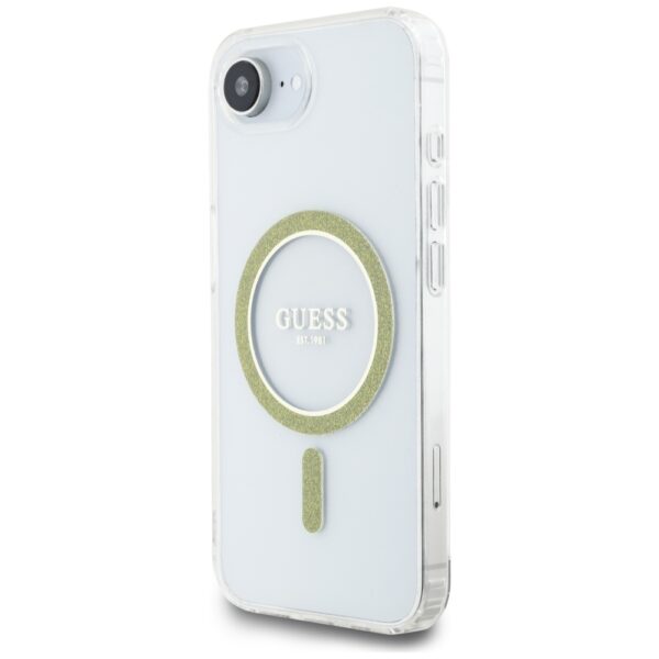 Originalus Dėklas GUESS IML Glitter Circle MagSafe skirtas Apple iPhone 16e skaidrus
