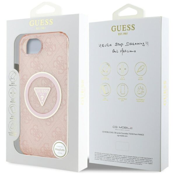 Originalus Dėklas GUESS IML Metal Glitter 4G Circle Triangle MagSafe skirtas Apple iPhone 16e rožinės spalvos