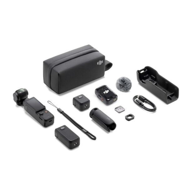 - Pakuotės turinys Camera mini tripod, Action camera, Transport bag, USB-C – USB-C cable, Protective case, USB cable, Hand grip, Wide attachment, DJI Mic 2 Transmitter, Wind shield, Microphone clip, Osmo Pocket 3 Battery Handle
