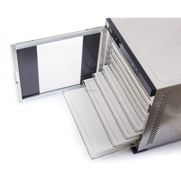 - Galite naudoti jį ruošdami saldainius iš naminio jogurto, traškių skanių picų, bananų blynų, keptos granolos, grūdų drožlių ar pyragų. Visa tai dėka skystų ingredientų džiovinimo dėklo.