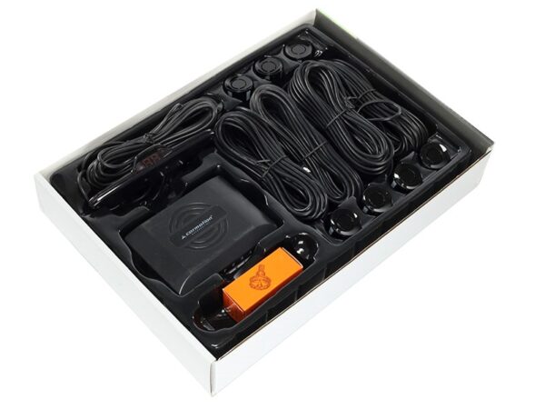 Parking assistance system with loudspeaker, 8 black sensors – front and rear