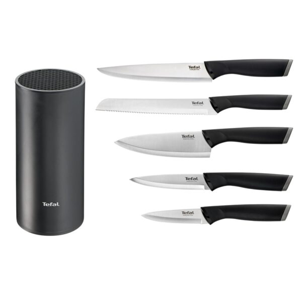 Prekės ženklas- Tefal. Kolekcija- Comfort. Artikulas- 2100136154. Ašmenų ilgis- 9 – 20mm. Medžiaga- Plastikas, Nerūdijantysis plienas. Galima plauti indaplovėje- Ne. Privaloma garantija- 24 mėn. Papildoma informacija- Universalus plastikinis peilių blokas (Ø11cm, 22.5cm), Šefo peilis (15 cm), Pjaustymo peilis (20cm), Duonos peilis (20 cm), Universalus peilis (12 cm), Daržovių peilis (9 cm).