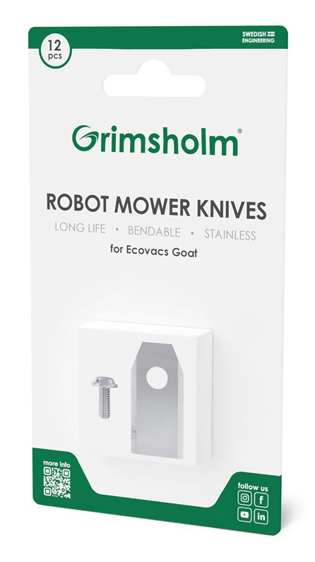 Žoliapjovės priedų tipas- Peiliukai robotui. Prekės ženklas- Grimsholm. Artikulas- ECOVACS GOAT. Medžiaga- Plienas. Privaloma garantija- 24 mėn. Priedas tinkamas- <strong data-start=”151″ data-end=”167″>Ecovacs GOAT</strong> vejos pjovimo robotams..