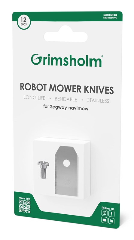 Žoliapjovės priedų tipas- Peiliukai robotui. Prekės ženklas- Grimsholm. Artikulas- Segway NAVIMOW. Medžiaga- Plienas. Privaloma garantija- 24 mėn. Priedas tinkamas- <strong>Segway NAVIMOW </strong>vejos pjovimo robotams..