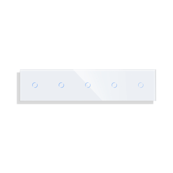 Grūdinto stiklo sensorinis penkiavietis vienpolis jungiklio dangtelis Feelspot FSSD511111W gali būti komplektuojamas su bet kuriuo jungikliu, rozete ir kitais lizdais.