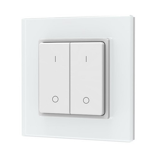 Dviejų klavišų belaidis reguliatorius PF1-2(G) su stiklo rėmeliu yra skirtas dviejų zonų, vienos spalvos LED apšvietimo valdiklių valdymui.
