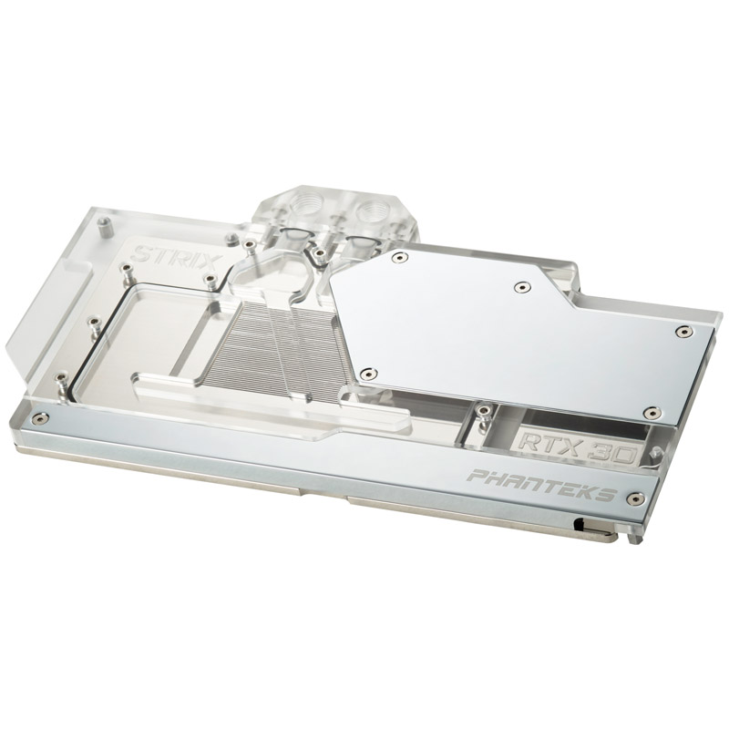 The PHANTEKS G30 Strix is a water cooler for custom water cooling systems with a full-block design. The cooler covers all relevant heat sources of the graphics card and ensures efficient cooling for the GPU, memory and voltage converters. The cooler base is made of nickel-plated copper to ensure effective heat dissipation thanks to its high thermal conductivity and optimised channel structure. The high-flow design keeps the resistance low and ensures a high flow of the coolant.