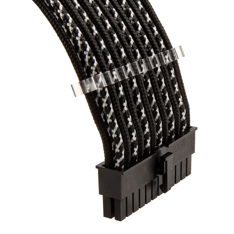 The extension cable set mentioned here relates to a 24-Pin ATX12V extension cable for the motherboard, a 4+4-Pin ATX12V-/EPS12V extension cable for the CPU and two 6+2-Pin PCIe extension cables for graphics card. This cable set contains a total of four black-silver sleeved power cables with black connectors. Two 24-slot, four 8-slot, and two 6-slot cable combs are additionally included. These allow individual cable sleeves to be perfectly arranged to leave your system looking extremely neat and tidy.
