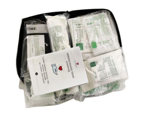 Prekės ženklas- -. Komplektacijos sudėtis- Palaikomasis trikampio formos tvarstis, Pirmosios pagalbos žirklės, Speciali antklodė nukentėjusiajam paguldyti ir (ar) apkloti, Sterilus žaizdų tvarstis, Vienkartinės pirštinės, Sterilūs pleistrai, Lipnus pleistras rulonėlyje, Sterilus spaudžiamas tvarstis, Nesterilus tvarstis, Pirmosios pagalbos gaivinimo kaukės dirbtiniam kvėpavimui atlikti, Vienkartinis šalčio maišelis, Turniketas, skirtas stipriam (masyviam) kraujavimui galūnėse (rankose, kojose) stabdyti, Pirmosios pagalbos teikimo atmintinė su turniketo naudojimo instrukcija. Pakuotės tipas- Medžiaginė. Atitinka DIN 13164 standartą- Taip.