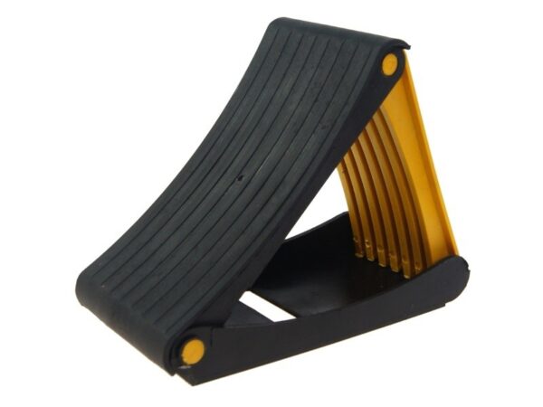 Folding wheel chock, made of durable ABS plastic, protects the vehicle during wheel changes or other repair work. The wedge is equipped with 4 metal teeth which, when unfolded, stick into the ground, preventing the vehicle from moving.