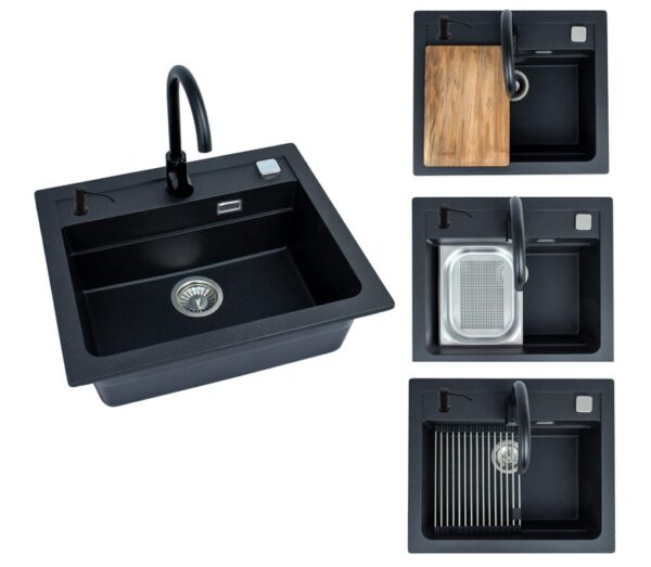 Prekės ženklas- Alveus. Ilgis- 68 cm. Plotis- 56 cm. Gylis- 22 cm. Forma- Stačiakampė. Spalva- Juoda. Skylė maišytuvui- Taip. Perbėgimo skylė- Taip. Montavimo tipas- Uždedama ant stalviršio, Įmontuojama. Su maišytuvu- Taip. Privaloma garantija- 24 mėn.