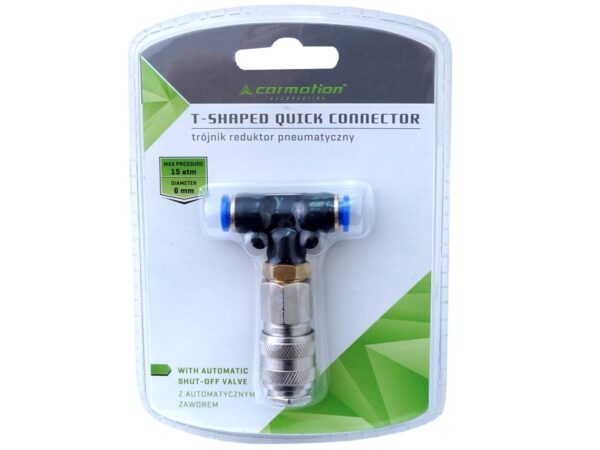 The reducer tee is equipped with standard fittings which allow the connection of various types of pipes to typical pneumatic installations. The reducer tee includes: – a silver tip (the compressor hose connected to it) – blue tip (clamps).