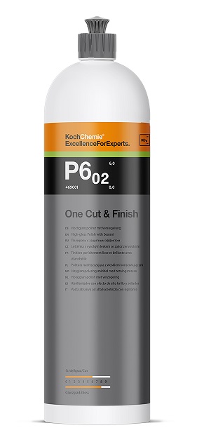 One Cut and Finish P6.02“ yra vieno žingsnio pasta su vašku, skirta pašalinti hologramas ir įbrėžimus. Pasta sujungia optimalų abrazyvumo ir blizgesio santykį, kad būtų ekonomiškas ir efektyvus darbas ruošiant transporto priemones.