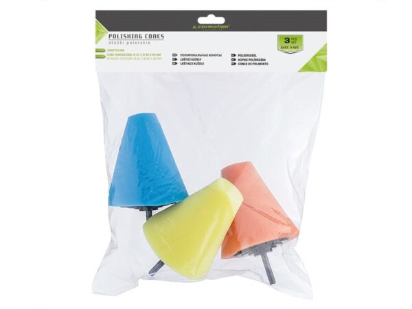 Set of three professional polishing cones. They are intended to polish hard-to-reach places. Perfect for polishing rims and corners. All sponges have the shape of a truncated cone with the following dimensions: 80mm x FI80 (base) x FI31 (top). Pin Length: 30mm. Careful workmanship and selection of materials guarantee high product quality. Cones can be used with professional polishers, drills and screwdrivers. The cones differ in their hardness: